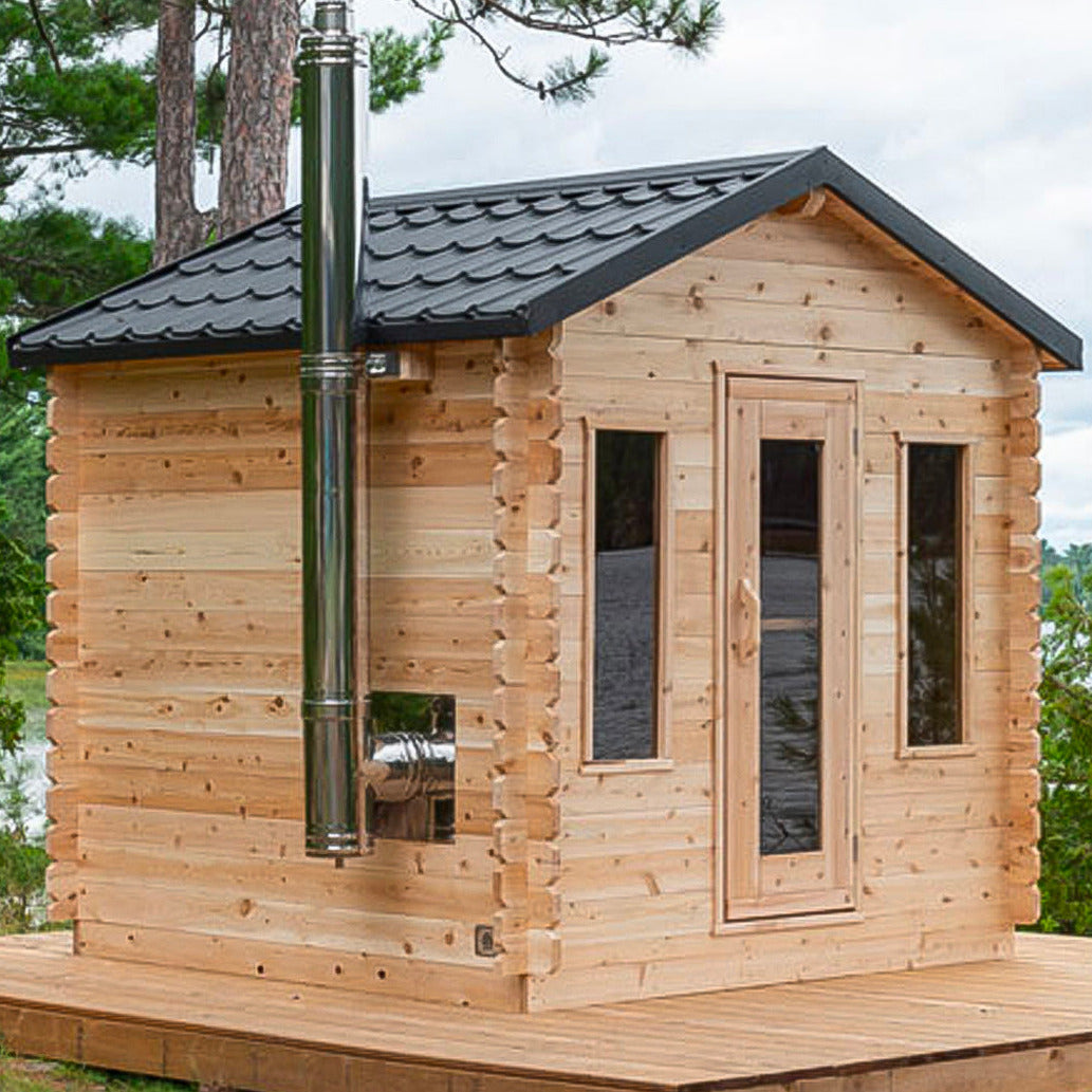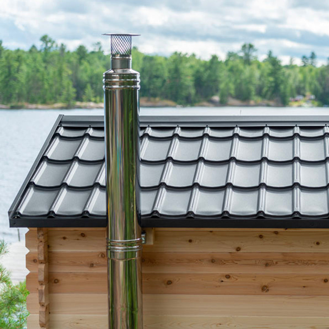 Experience the timeless tradition of sauna bathing with our wood-burning stove options, designed for easy interior stoking. Each model is attached to an insulated chimney, ensuring safe and efficient heat distribution. Heat shields for floor and wall/roof included. Chimney out of the side