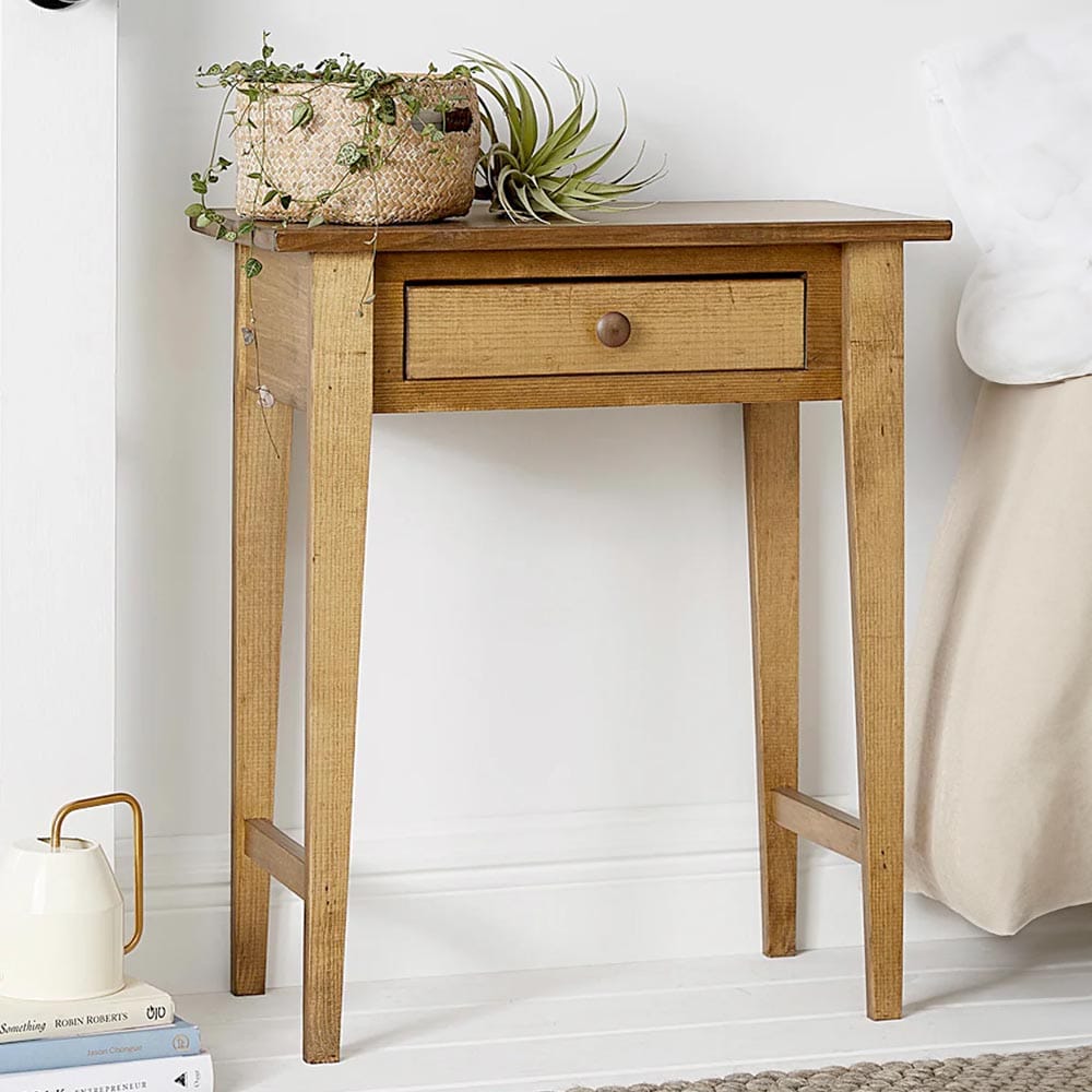 Small in stature but incredibly useful this small hall table is ideal for those with limited space or cramped hallways. With a handy drawer for storing keys and other small objects, it works well in the hall, as a bedside table or even as a telephone table. Supplied with a stained top, the sides and legs can be finished in a variety of colours to let you put your own mark on it.